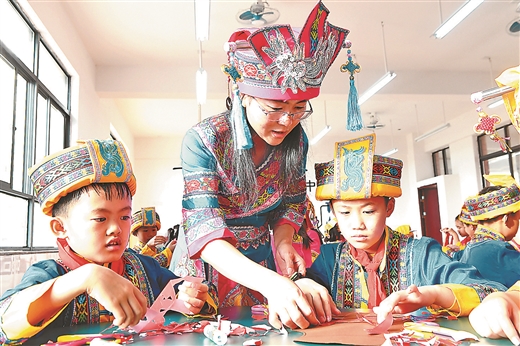 仫佬族學(xué)生在學(xué)習(xí)剪紙技藝。