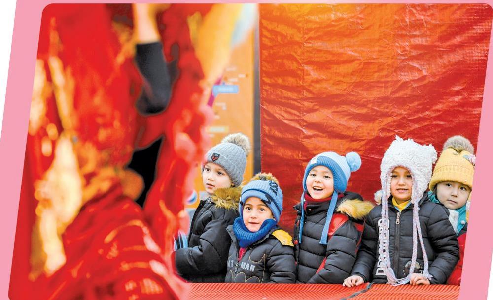 小朋友在新疆烏魯木齊大巴扎步行街觀看元宵節(jié)舞獅表演。 新華社記者 王菲 攝