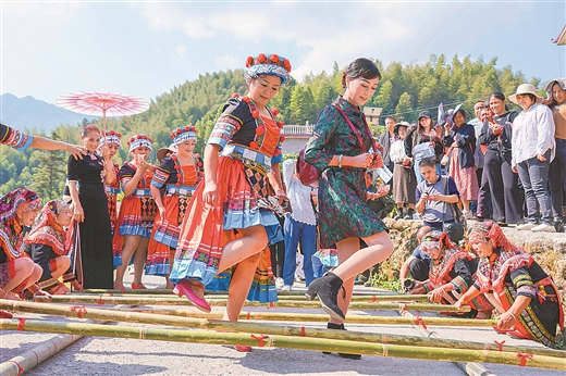 11月9日農(nóng)歷十月十六,在全州縣紹水鎮(zhèn)桐油村,瑤族同胞以織瑤錦、打糍粑、跳竹竿舞、對山歌等多種形式歡慶盤王節(jié),吸引眾多游客前來體驗。唐廣東/攝