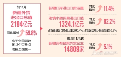 □石榴云/新疆日報記者 陳薔薇“今年新疆外貿(mào)進出口總值首次突破2000億元大關(guān),外貿(mào)保穩(wěn)提質(zhì)創(chuàng)歷史新高?!弊灾螀^(qū)商務(wù)廳對外貿(mào)易處處長付朝紅說。據(jù)烏魯木齊海關(guān)統(tǒng)計,前11月新疆外貿(mào)進出口總值達2194億元,同比增長59.8%,高于全國增速51.2個百分點,增速全國第一。