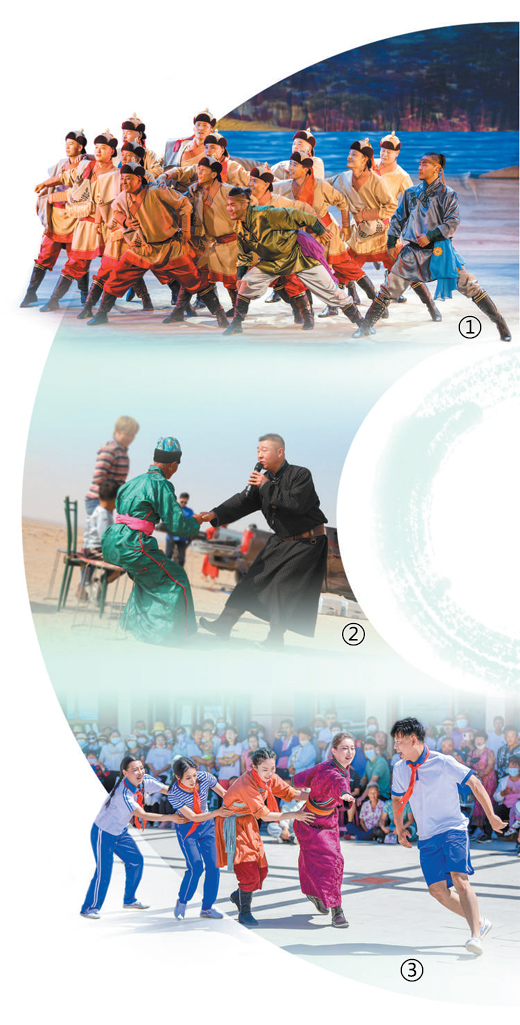 圖①:阿拉善盟烏蘭牧騎演出劇照。圖②:阿拉善盟烏蘭牧騎演員金格日勒(右一)下鄉(xiāng)演出。 圖③:2022年8月,土默特左旗烏蘭牧騎在基層演出。 以上圖片均由翟欽奇提供 制圖:趙偲汝 |